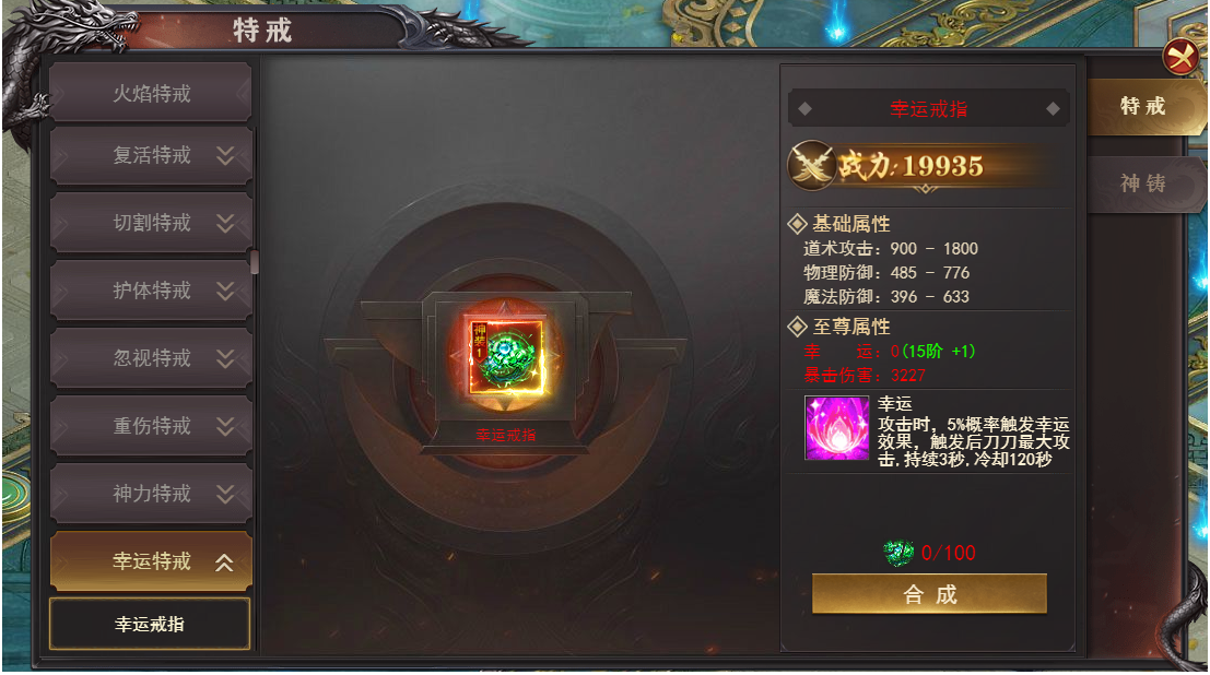 1、幸运特戒:穿戴幸运特戒后,增加基础属性,激活幸运技能以及增加幸运值。