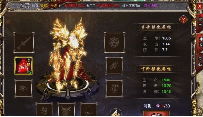 获取神灵装备后,玩家可以通过挑战凌霄宝殿的BOSS来进一步提升装备的等级和属性。同时,通过合成系统中的神灵精魄材料,可以对装备进行升阶。装备最高可升至300级,每升一级都能获得更高的生命、攻击和防御属性加成。