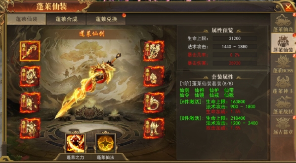 蓬莱仙装:通过蓬莱仙岛获得仙装材料,使用材料可以兑换装备。集齐套装可以激活特殊效果,如蓬莱之力和蓬莱仙法。