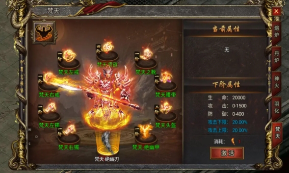 焚天装备在开服90天后,当玩家的神火等级达到4级(紫薇天火)时解锁。玩家可以通过点击“熔炉”-“梵天”进入详细界面。