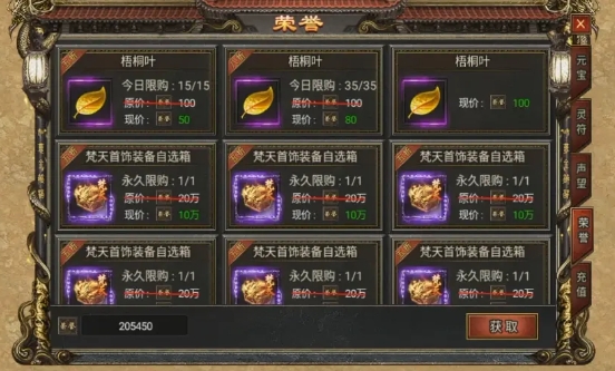荣誉商店兑换:每日在荣誉商店中兑换梧桐叶,荣誉值可以通过每日充值转转盘获得。