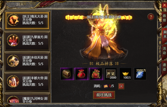 《白蛇传奇》洞天BOSS是单人副本的核心资源口,每天6:00-24:00开放,从首领挑战-洞天入口进入。每天限打5次,0点重置次数,但有个隐藏机制:难度越高,消耗的洞天通牒越多,奖励也越肥。随机神魔宝袋、洞天奖励箱、元宝、声望、法宝宝袋、天地精华——这些硬通货的掉落数量,直接和你的勇气挂钩。