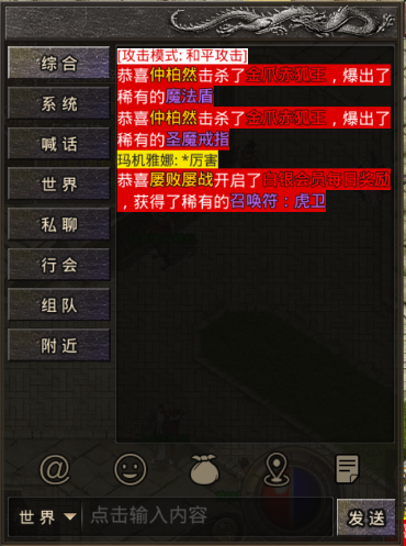 主界面正下方区域点击可拓展显示聊天系统界面。包括综合、系统、喊话、世界、私聊、行会、组队和附近频道。玩家可以在对应频道交流互动。
