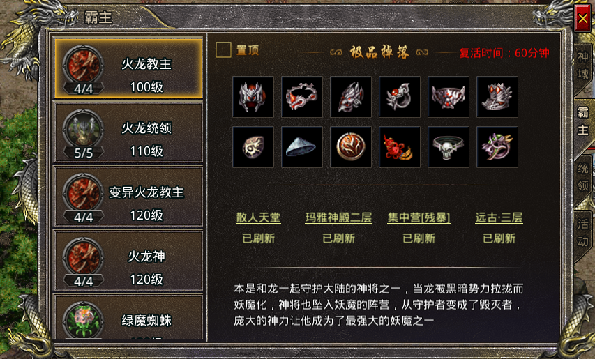 每日挑战统领。玩家通过击杀统领怪物。完成任务每日获得火龙珠、荣誉、金刚石等奖励
