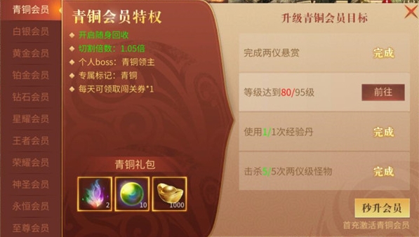 80级开始是一个非常重要的阶段,将逐步开启沙城无双的各类玩法系统。突破80级后,将开启免费会员系统,完成任务即可获得该等级会员,享受各类特权。