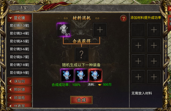 获取渠道:第三大陆NPC"法宝"处合成,未解封法宝+解封符+元宝合1-3星,3星+解封符升4星,逐级合成或跳级,指定次数必出极品。