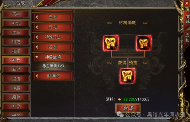 大家要想获得神兽坐骑,可通过一些运营活动,有机会获得LV1级的坐骑神兽。我们要想获得其他高级的坐骑神兽,就要通过合成系统,将两个完全相同的坐骑神兽,合成更高一级的坐骑神兽,合成需要消耗大量的元宝,合成成功几率为百分百成功。