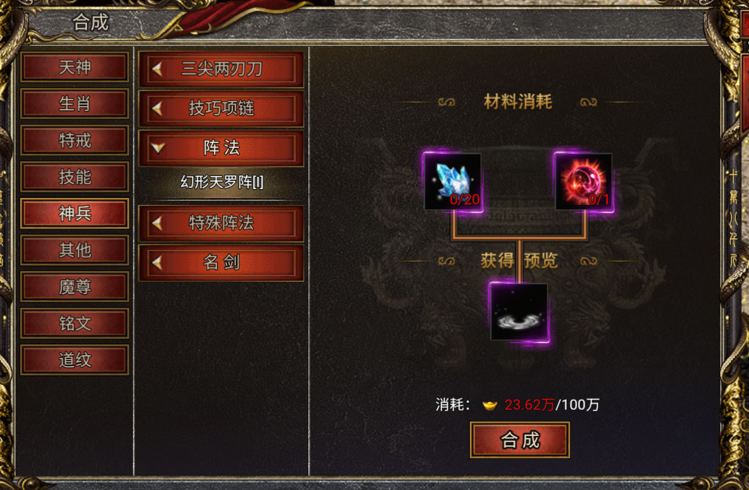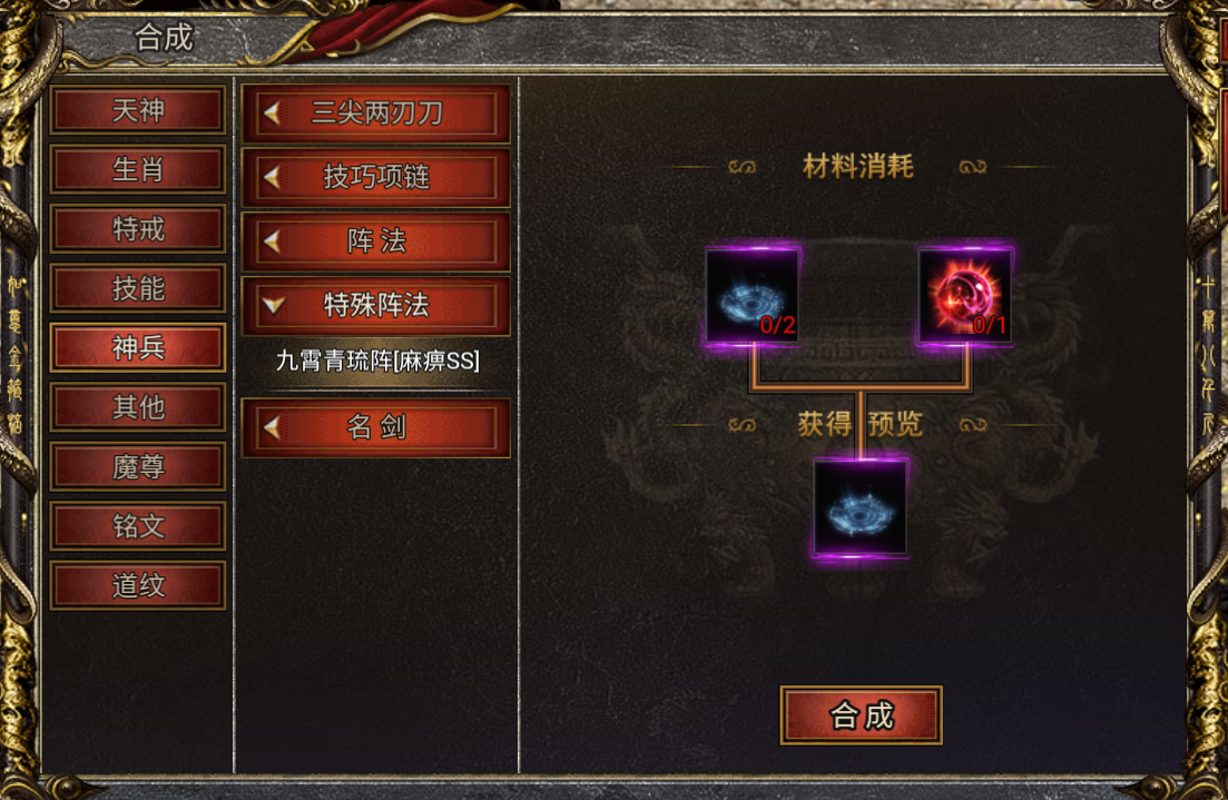 在白蛇传奇游戏中想要无视防御的百分比伤害这个属性,就需要通过开通阵法来实现。在合成-神兵界面中,玩家可以看到阵法和特殊阵法两个选项。