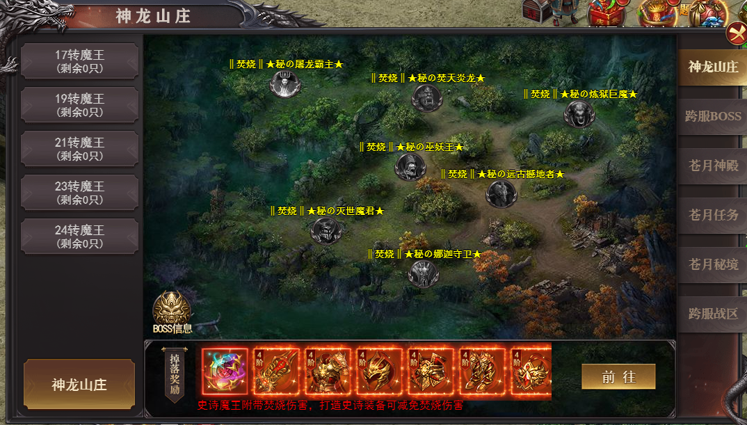 开服第30天可进入神龙秘境,刷新7只黄金焚烧BOSS