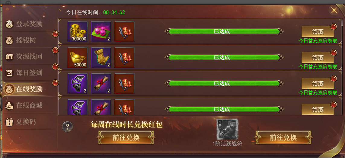 1、每周累计在线时间在线送钻石改为在线送活跃令。