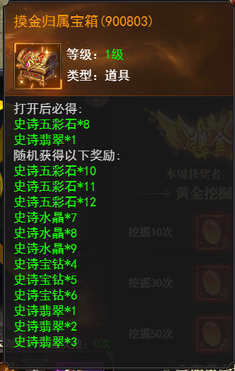开服第30天可选择黄金挖掘,黄金挖掘可获得史诗翡翠、史诗五彩石珍稀材料