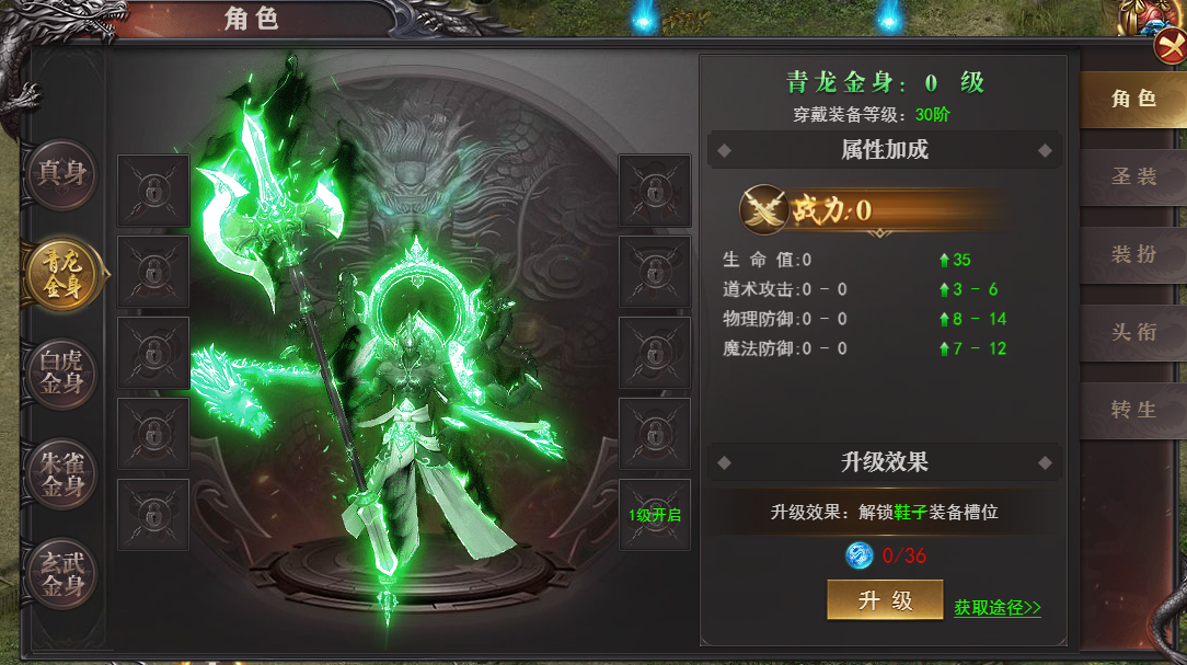 3、使用金身材料可升级金身,升级金身分为3个阶段