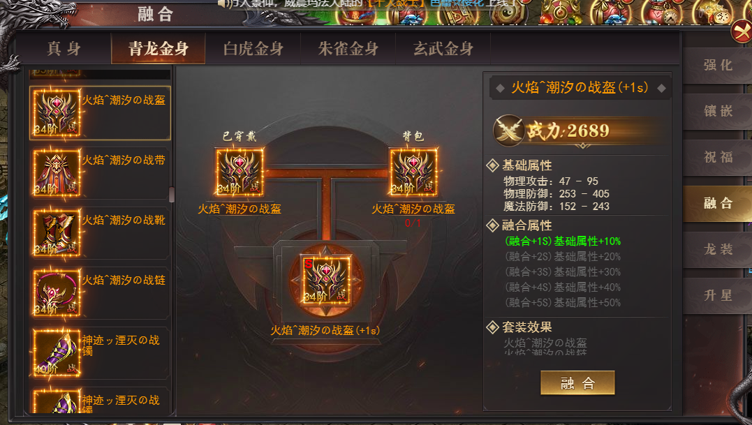 新增金身系统,可通过相应金身魂魄升级金身,每个金身可额外穿戴一套转身装备,且金身穿戴装备不受装备转生限制,金身穿戴装备不继承附件属性:幸运、铸龍、强化等,附件属性仅主角穿戴生效