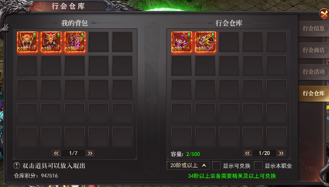 开服第7天后开启行会仓库,行会成员可捐献装备进行兑换