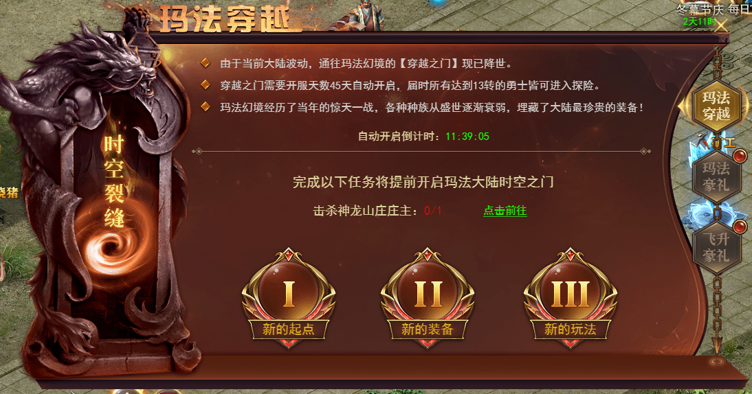完成开启任务后,直接提前开启玛法幻境。全服达到13转的玩家可进入新的跨服主城-玛法幻境