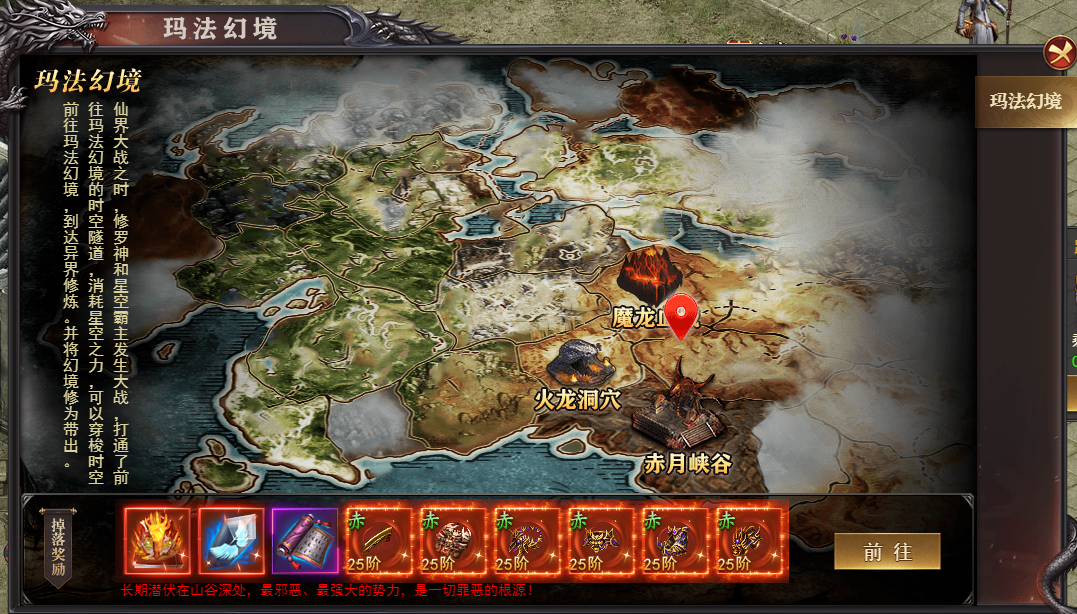玛法幻境暂开放3张地图:赤月峡谷,魔龙血域,火龙洞穴,每个地图2层,二层深处有地图超级恶魔boss刷新,超级恶魔进入地图可以看到刷新状态