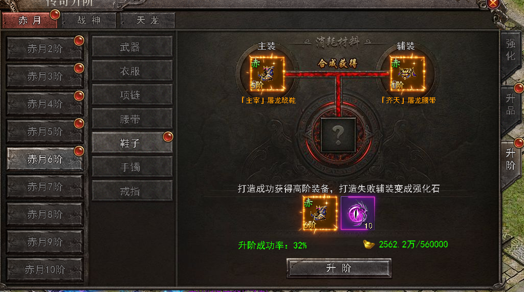 升阶需要主装备和副装备,升阶成功主装备提升1阶。升阶失败副装备破碎为相应强化石,主装备保留