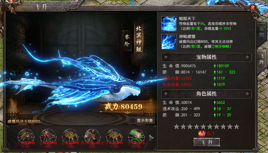 效果:100%眩晕幻境怪物。提升宠物飞升等级,可震慑幻境的怪物上限提高
