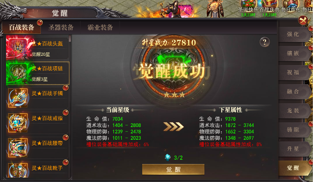 1、百战装备、圣器和霸业装备开放觉醒,开服达到一定天数可以觉醒相关装备
