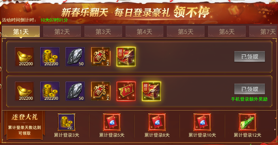 活动期间每日登录可领取一份登录奖励,手机登录可以额外领取一份,还可以获得节日助手激活卡。(手机端或手机浏览器网址登录都可以领取)