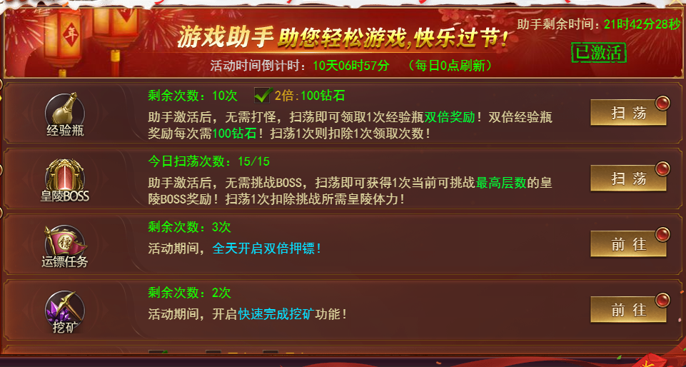 活动期间每天手机登录游戏都可免费获得节日助手激活卡,激活后能快速完成日常任务。