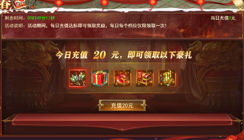 活动期间每日充值达标要即可领取奖励,每日每个档位仅限领取一次。