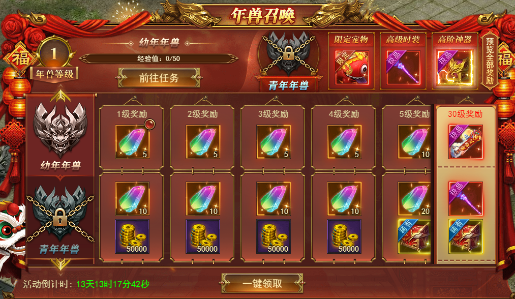 完成任务即可获得年兽经验是年兽成长,每一级可以领取相应的奖励,更有大奖等您来拿。激活青年年兽成长奖励更丰富。