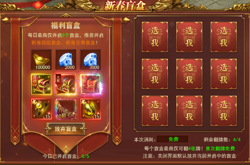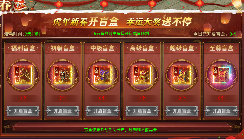 活动期间参加新春活动可以获得各种盲盒,开启盲盒可以获得各种奖励,每日可开启5个盲盒,每个盲盒开启后可以翻牌4次,开启至尊盲盒奖励更丰厚。