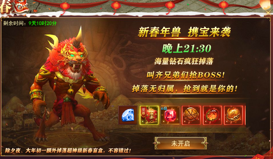 活动期间,晚上21:30开启年兽来袭,海量钻石道具疯狂掉落。掉落无归属,抢到就是你的!
