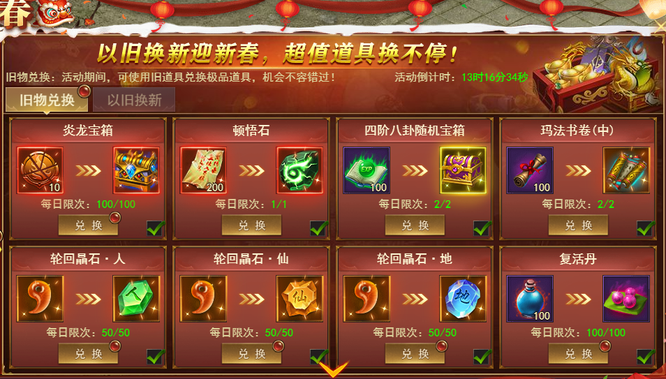旧物兑换-可以使用多余的道具在商城里兑换成需要的道具,每日兑换次数重置,机会不容错过!