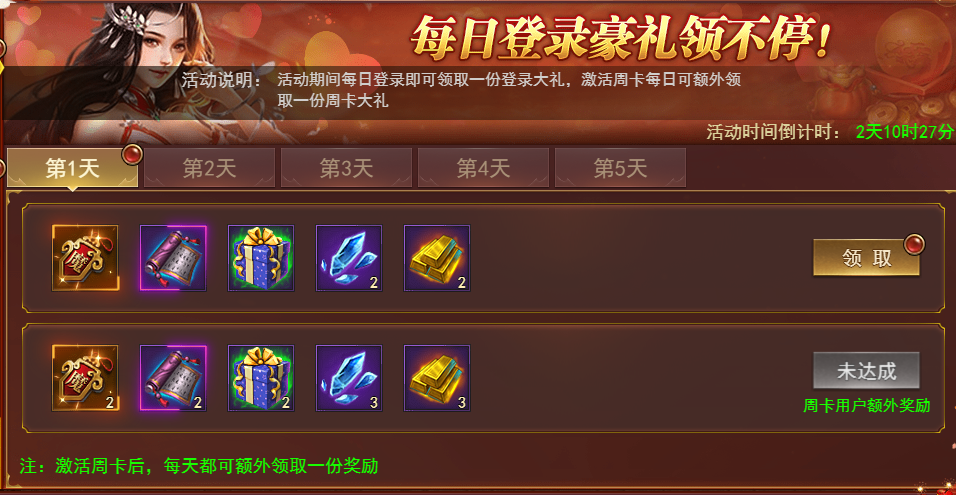 活动期间每日登录可领取一份登录奖励,周卡用户可以在领取一份。