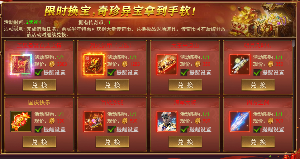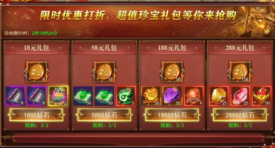 超值礼包等您拿,购买即可获得传奇币和其他珍贵道具奖励,传奇币可在商城兑换极品道具,每种礼包限购3次。