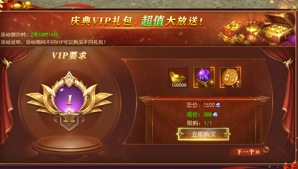 活动期间不同VIP可以购买不同礼包,超低折扣,超划算,机会不容错过。