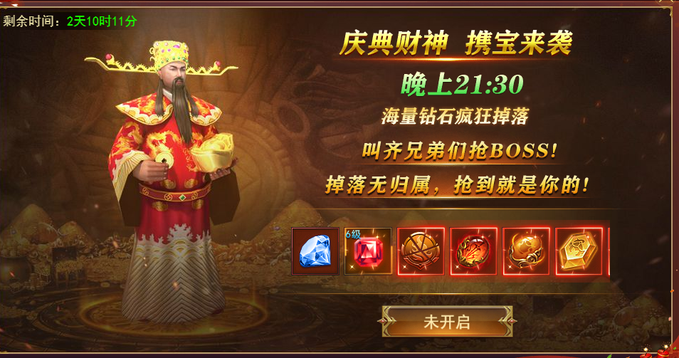 活动期间,晚上21:30开启庆典财神,海量钻石道具疯狂掉落。掉落无归属,抢到就是你的!