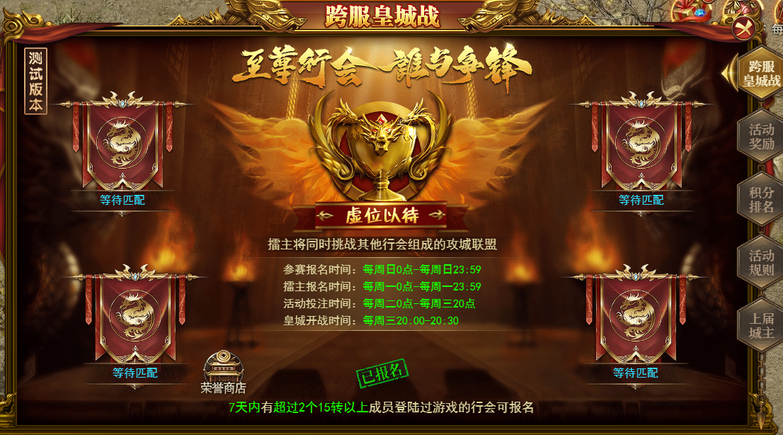 3、非皇城行会参与条件--7日内登陆游戏的成员(15转以上)超过5人的行会方可参与。