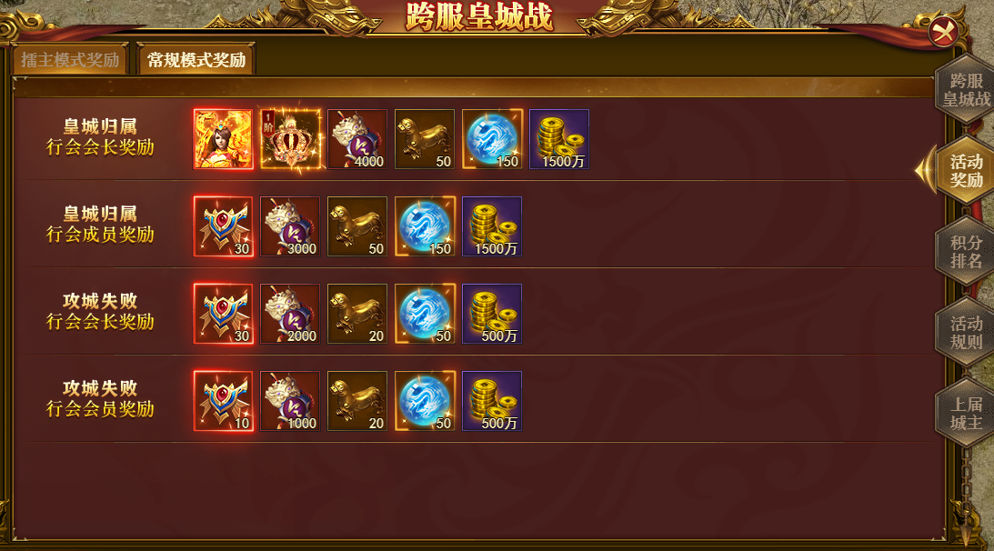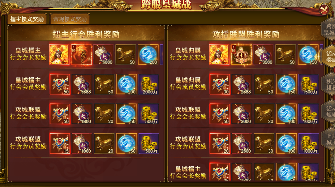 活动结束后,最终皇宫占领方不是擂主行会,则视为守擂失败,攻城联盟中积分最高的行会成为本场跨服皇城战霸主。