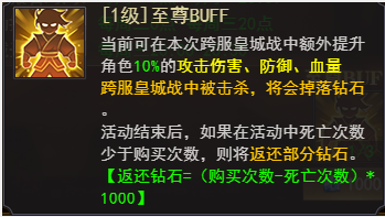 活动结束后,如果被击杀的次数少于购买至尊BUFF次数,即可获得剩余次数的钻石返还。