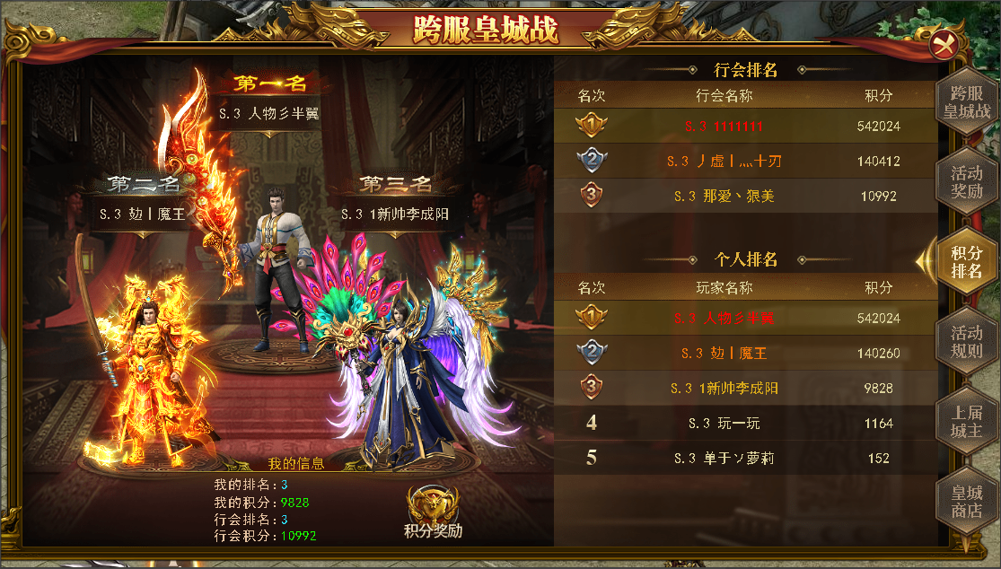 3.活动中,在皇宫场景每10秒即可获得8积分;在活动皇宫场景中,攻击300万战力以上的玩家时,每输出伤害100万伤害即可获得5积分。