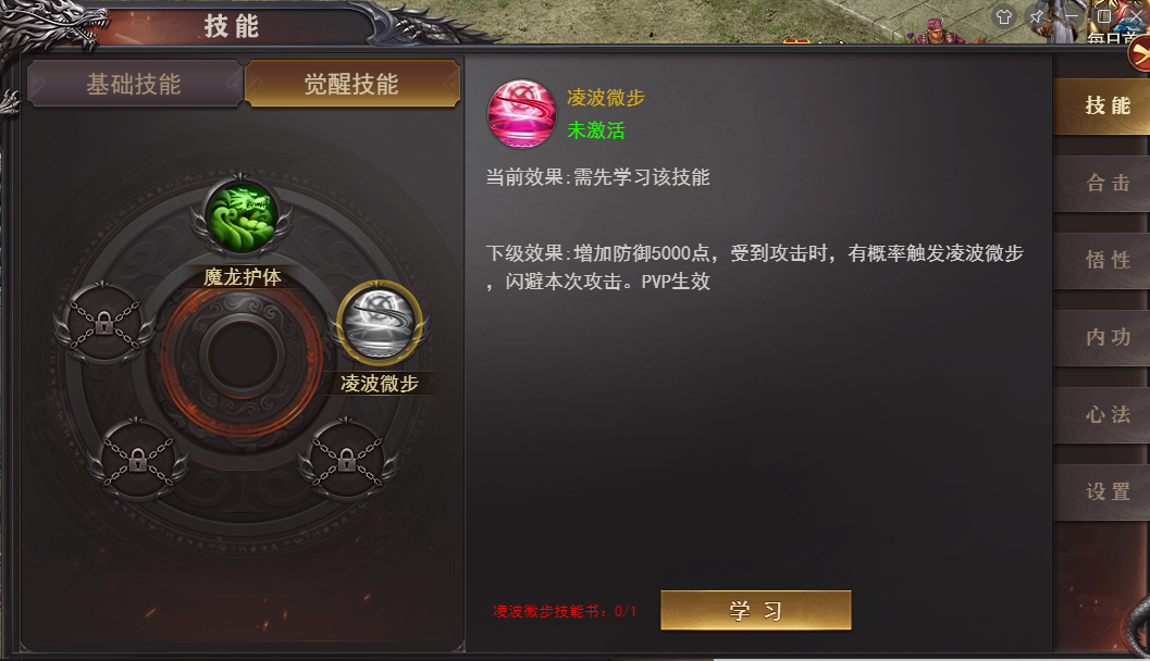 5.凌波微步:每级增加防御属性。受到攻击时,有概率触发凌波微步,躲避此次攻击(PVP有效)