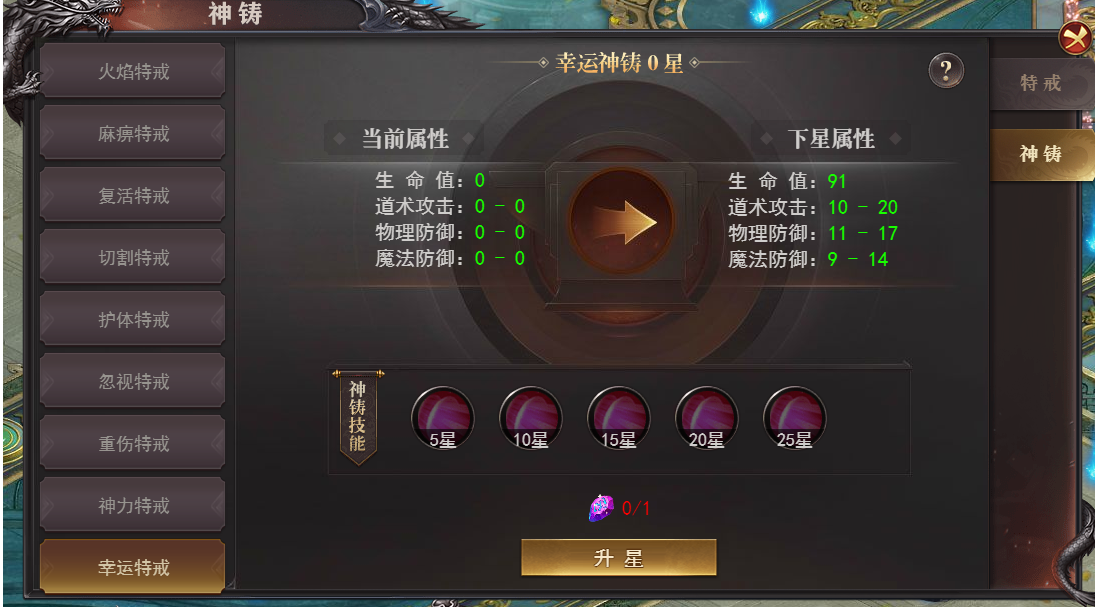9、神铸技能:达到指定的星级可激活技能,效果为触发幸运技能后,下次攻击伤害增加百分比
