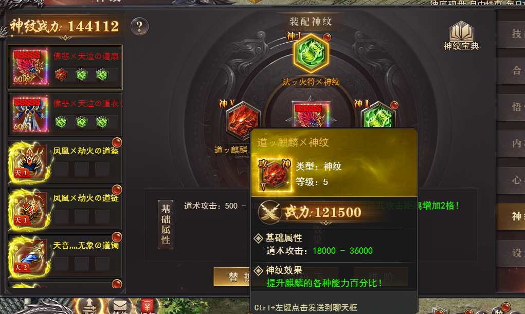 (7)神纹穿戴后可进行升级,升级增加基础属性以及技能加成效果(已穿戴神纹+神纹碎片进行合成下一阶)神纹碎片可通过分解多余的神纹进行获取