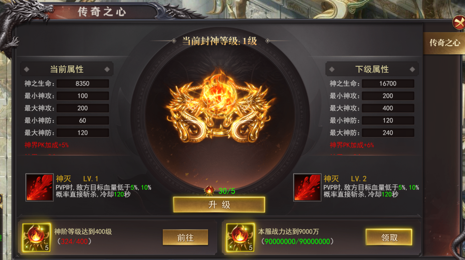4、升阶属性:激活后增加PK加成5%、PK减免5% (只限神界)