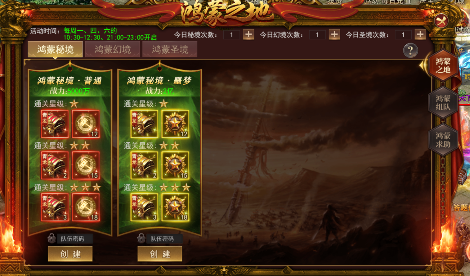 2.副本次数:每一个副本至少组队2人,最多组队6人。可自己创建对应的房间,可设置房间密码。每一个秘境副本每周可以打3次,可购买2次