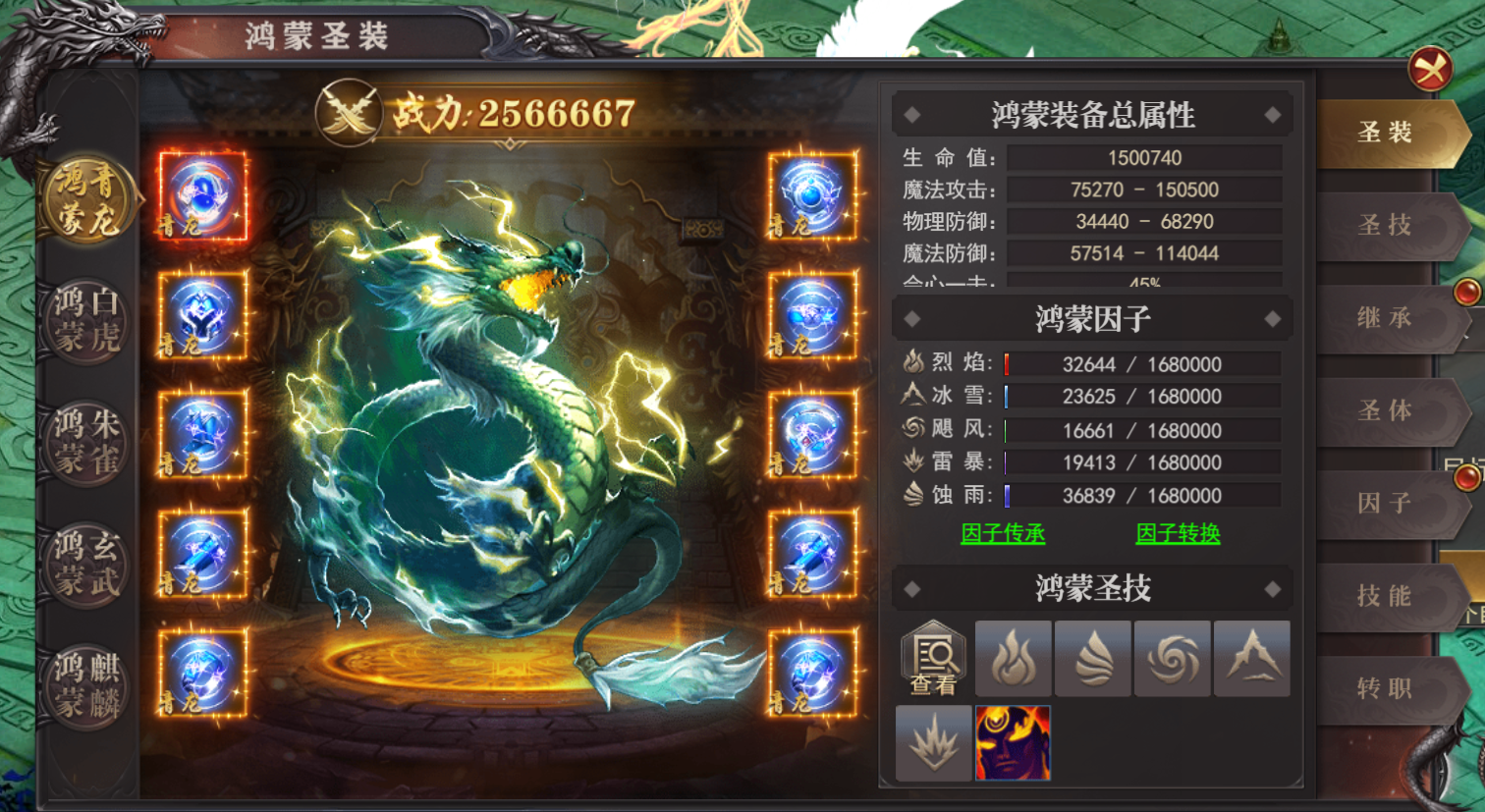 圣装类型:总共5套:青龙、白虎、朱雀、玄武、麒麟。每套10件套,完成对应鸿蒙转职任务后即可穿戴