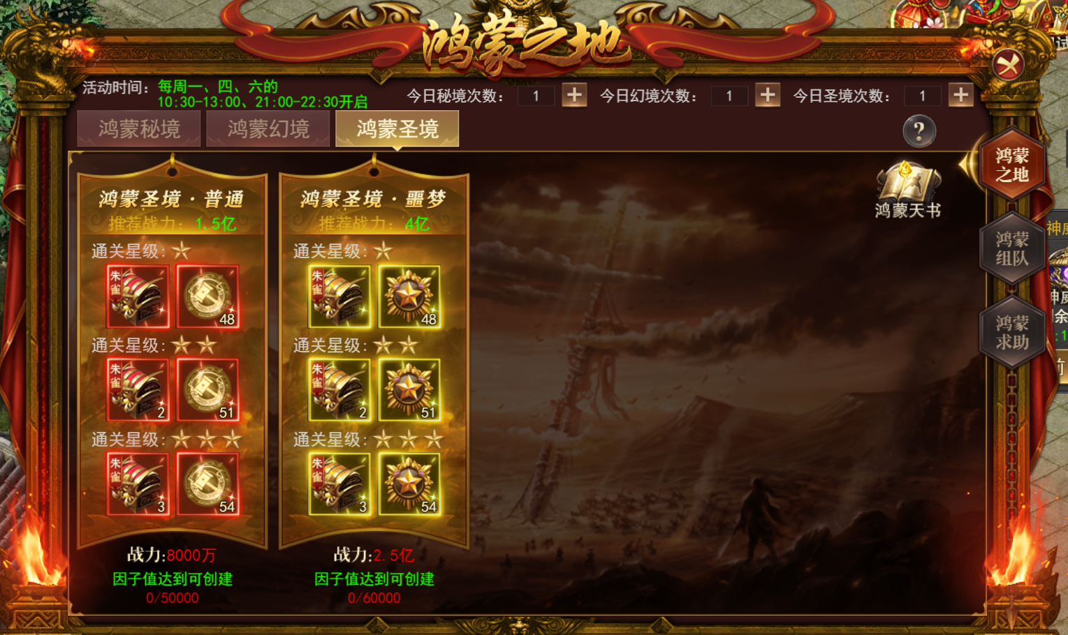 2.副本次数:每一个副本至少组队2人,最多组队6人。可自己创建对应的房间,可设置房间密码。每一个秘境副本每周可以打3次,每次活动可购买2次