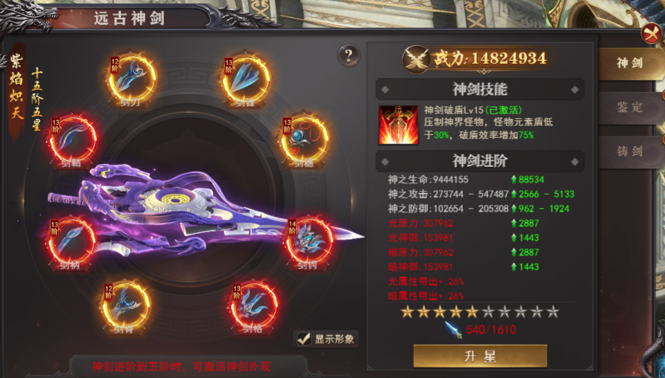 2.神剑升星:需要使用神剑之心进行升星,每一阶有10星