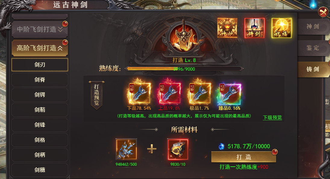 (1)使用飞剑碎片+对应材料可以打造出来任意品质飞剑