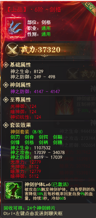 套装属性:神之生命、神之攻击、光原力、暗原力、光神御、暗神御