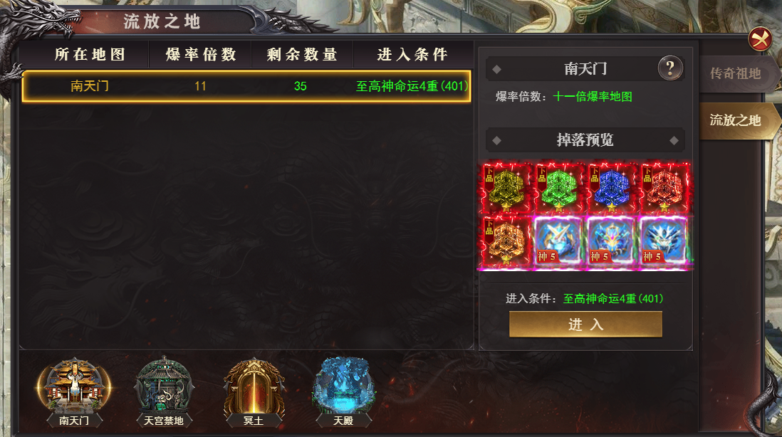 进入条件:神界等级达到至高神命运4重(传奇祖地-流放之地)