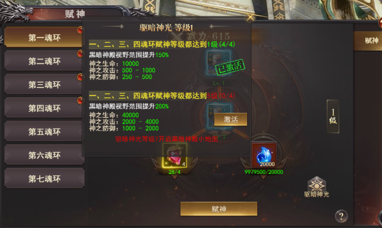 (3)对应魂环达到一定等级可激活驱暗神光(黑暗神殿视野范围提升,提高神之生命/攻击/防御)